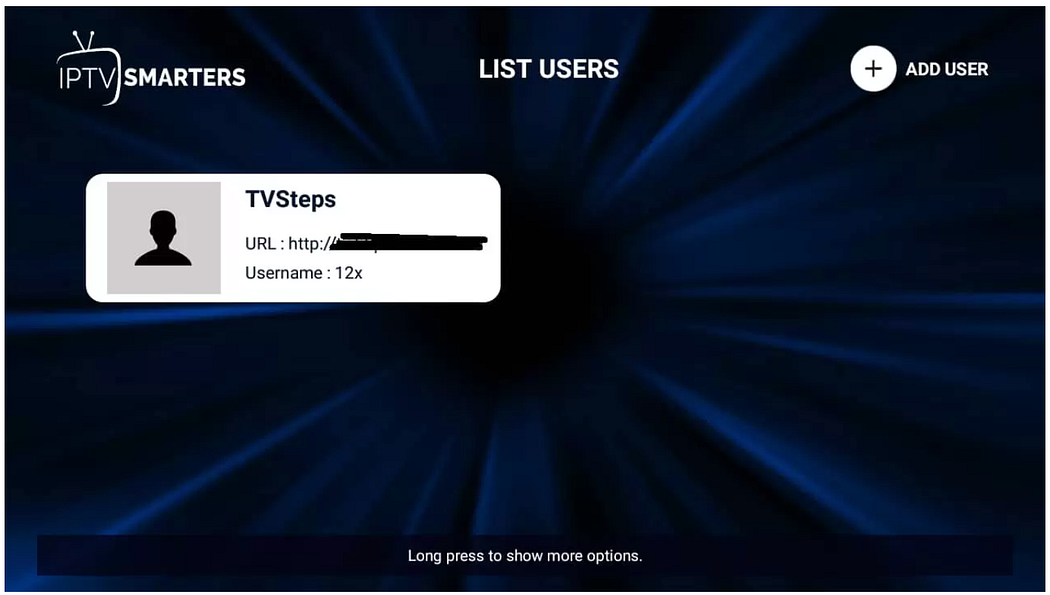 When you open the app, you need a playlist to watch. Click to add a new playlist. You'll need to enter a username, password, URL, and pick a name for your account.